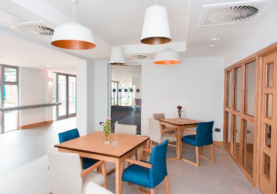 A naturally lit spacious dining area with long windows viewing the courtyard at Kingsley care home